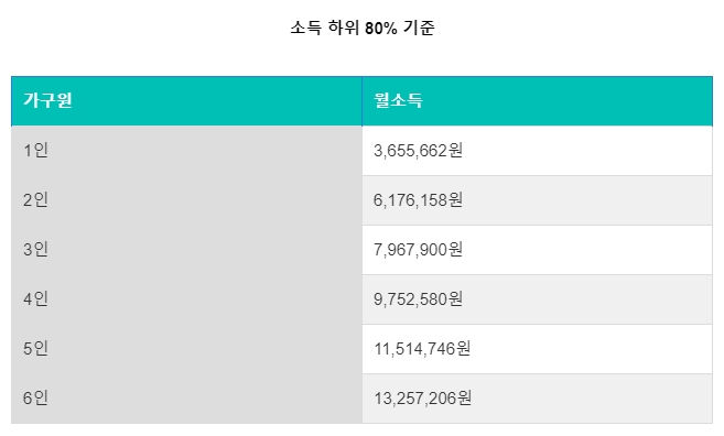 소득 하위 80%의 기준은 건보료 책정 때 쓰이는 보건복지부 고시로 예상되며, 아래 표와 같습니다.