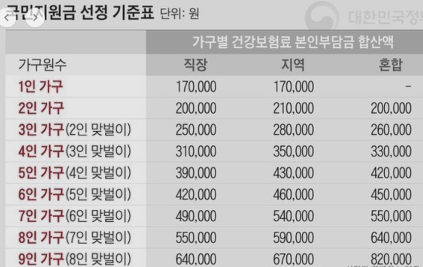 가구 내 소득원이 2인 이상인 맞벌이 가구는 가구원 수를 1명 추가해 기준을 적용합니다. 단 지역가입자는 지난해 종합소득이 300만원 이상인 경우를 소득원으로 봅니다.