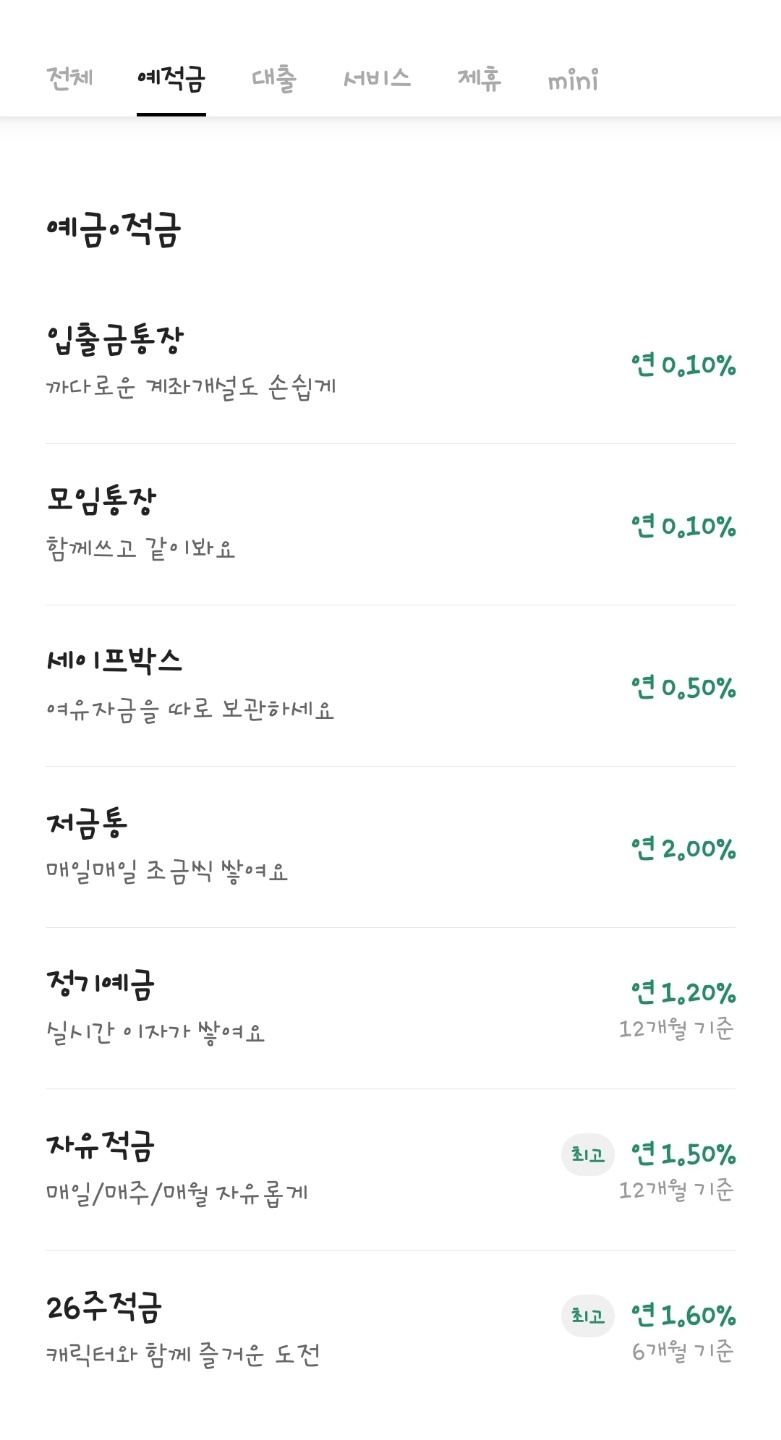 카카오 뱅크 상품/서비스의 전체 페이지를 살짝 살펴보겠습니다.