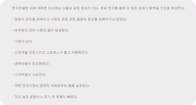 구체적으로 염증이 줄고, 만성통증이 감소되고, 혈액이 묽어 지고, 불면증이 개선되고, 스트레스가 줄어들며, 어떤 사람은 암이 나았다고 하기도 합니다. 몸이 건강해졌다는 증언이 대단히 많습니다. 후속 연구로 더 많은 긍정적 효과가 밝혀지게 될 것이라고 얘기합니다.