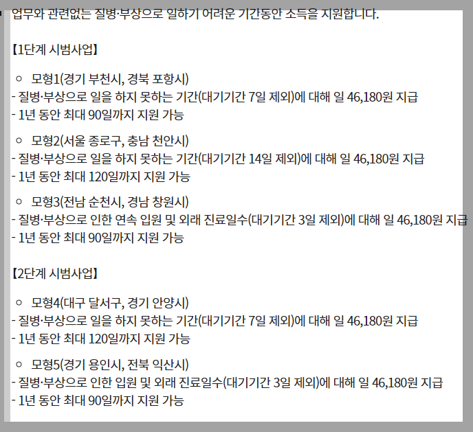 부상이나 질병으로 일할 수 없는 기간 동안, 하루 46,180원을 지급한다고 합니다.