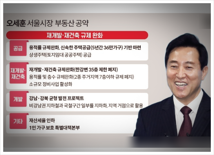다만 오 시장은 재건축 활성화보다는 재개발에 더 집중하고 있습니다. 오 시장은 재개발 규제완화 정책이 이미 6차례나 나왔기 때문에 공공기획, 상생, 모아주택 등 기존 공약을 구체화할 가능성이 높습니다.