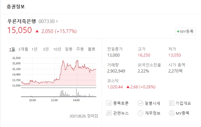 푸른저축은행 주가 21% 오름?